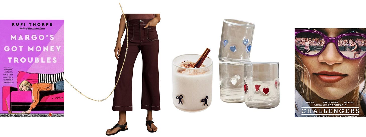 📚 Margot’s Got Money Troubles by Rufi Thorpe: Reading this outrageous book (out today!) on a recent park date with a friend, I kept interrupting her flow to read aloud sentences, “He was a wind chime in human form, dangling dorkily from the glorious tree of higher education.” In it, Margo drops out of college to have a baby (the father is the dorky wind chime, her former professor), and is immediately hit by the weight of the challenge and financial impossibility. She creates an OnlyFans account, which—stick with me here—gains popularity when her dad, a former pro wrestler, gives her tips on the art of creating a branded personality. Original and empathetic to its core. Elle Fanning, who reads the audiobook, recently signed on to star in the AppleTV+ adaptation!
