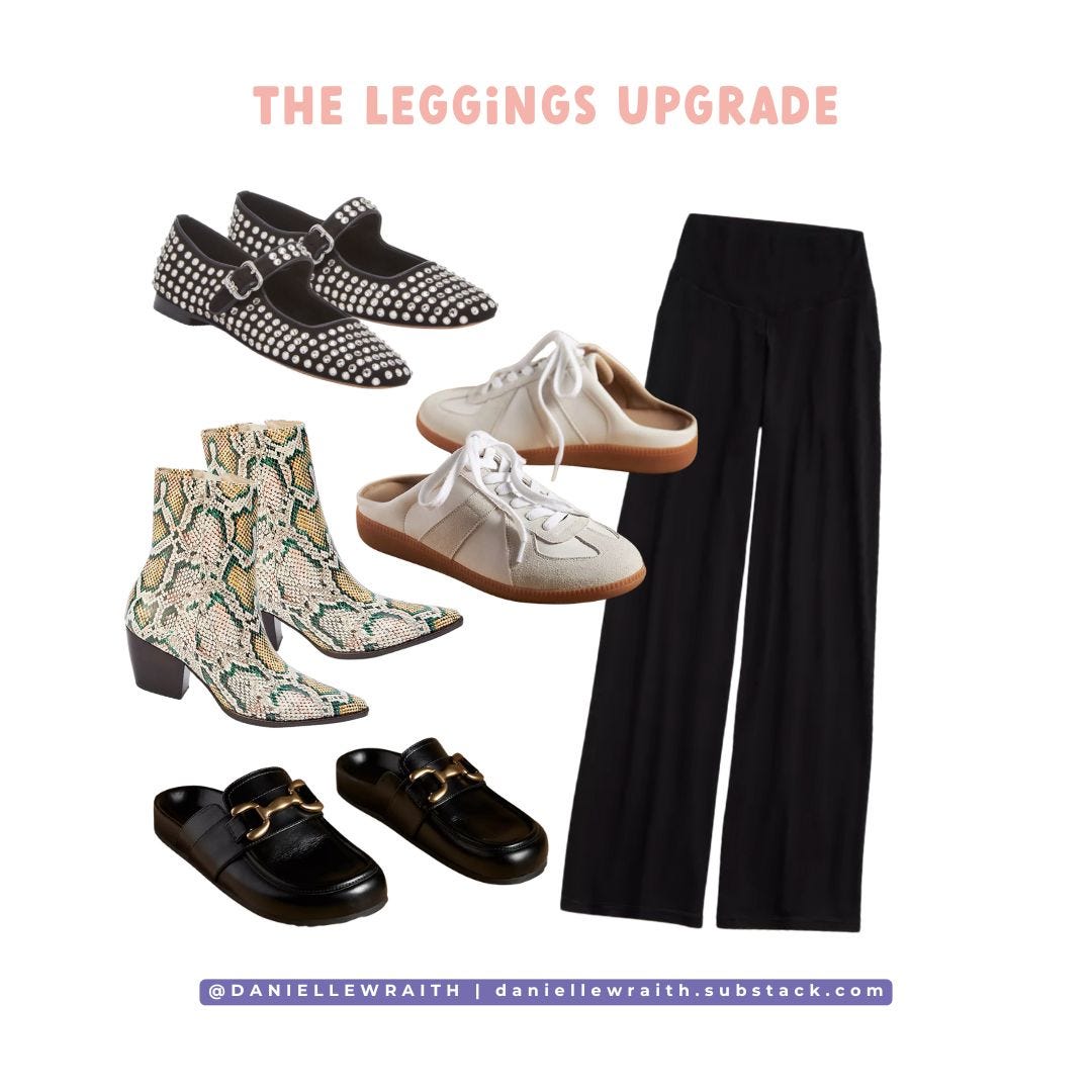 Leggings + oversized sweater + structured shoes. Leggings are allowed, but the trick is the shoe.