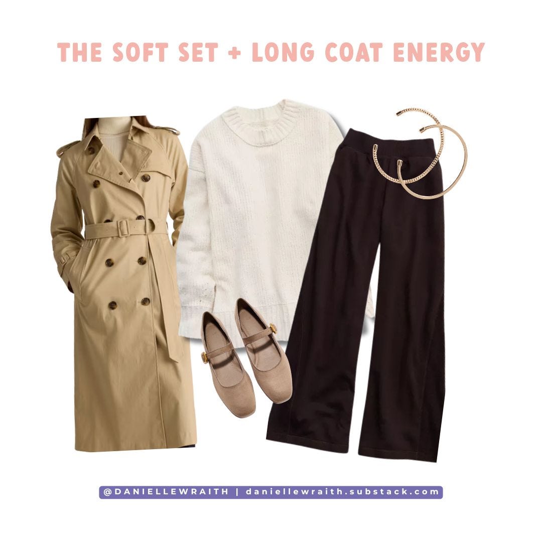 Matching knit set (or same-color top + bottoms) + long cardigan or coatigan
